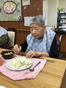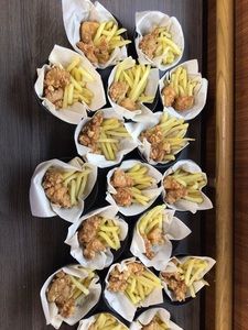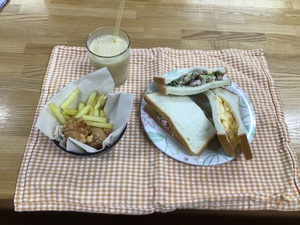 4月27日に食事レクリエーションをさせていただきました。今回はなんとサンドウィッチ、鶏のから揚げ、ポテトフライ、ミックスジュースを作りました。