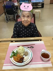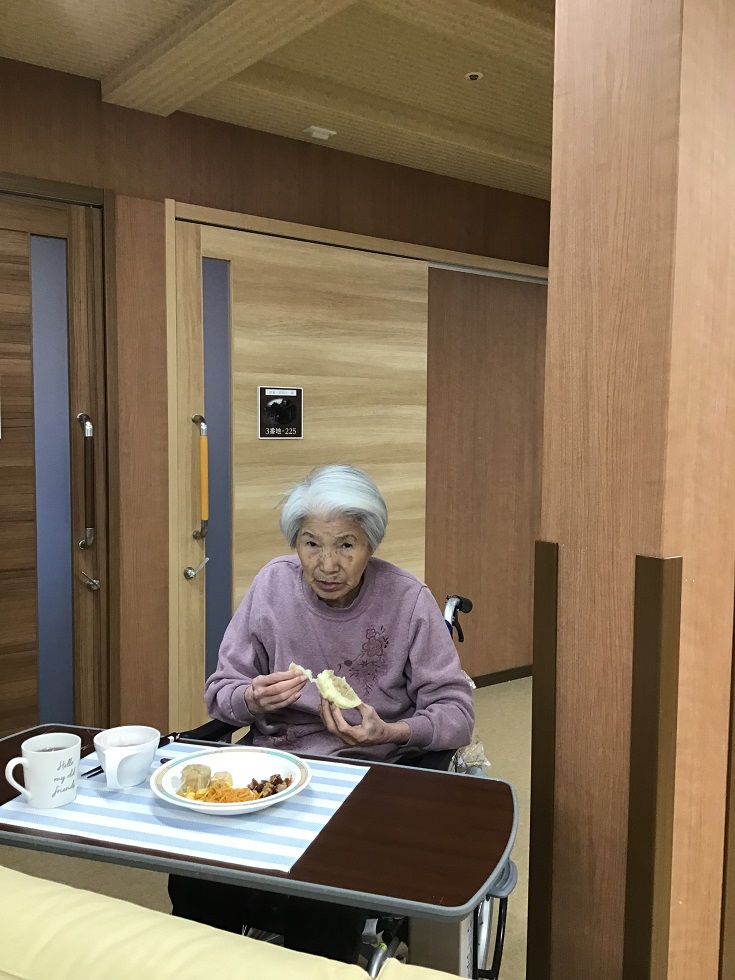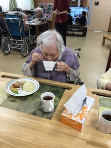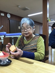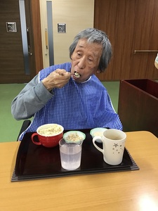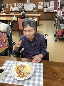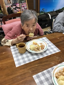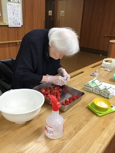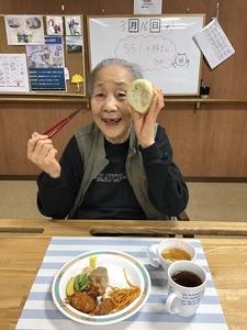 キザミ食の利用者様でも食べてもらえるように半分にカットして提供しました。